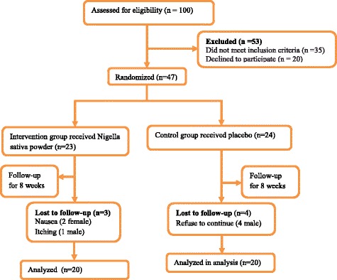 From 100 recruited subjects, 53 participants were excluded because of not meeting the inclusion criteria or decline to participate. Among remaining 47 patients, random permuted block procedure was performed and participants were randomly allocated into Nigella sativa-treated (n = 23) or placebo-treated (n = 24) groups. During the trial, three patients in Nigella sativa-treated group were excluded from the study because of itching and nausea; while four patients in control group refused to continue the trial. Therefore, totally 20 patients in each group completed the study. Patients in the intervention group received a daily dose of 2 g Nigella sativa powder per day and placebo group received 2 g starches per day for 8 weeks. The dose of the Nigella sativa and time period of the study had been selected according to review of the previous studies indicating the effectiveness of 2 g of Nigella sativa or even lesser doses and 8 weeks study duration in treatment of numerous metabolic disorders including immune disturbances and lipid abnormalities [26, 27].