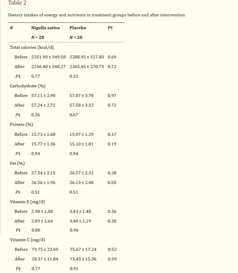 Body weight and height were measured with a calibrated digital scale and stadimeter respectively. BMI was calculated as weight (kg) divided by height (cm) squared. Waist circumference (WC) was measured in horizontal plane, midway between the lowest rib and the iliac crest with a measuring tape in centimeter. Waist to hip ratio (WHR) was calculated by WC divided by hip circumference (HC). The dietary assessments were performed using a 3-day food record, covering two weekdays and one weekend day, to estimate total energy, carbohydrate, protein, fat and antioxidant vitamins consumption. Because of the antioxidant nature of Nigella sativa the intake of vitamin E and C were specifically evaluated to ensure that no change in their consumption has been occurred throughout the trial and to rule out their possible confounding effect on study parameters. Nutrient analysis of the 3-day food record was performed using the Nutritionist IV software (N-squared Computing, Salem, OR, USA).