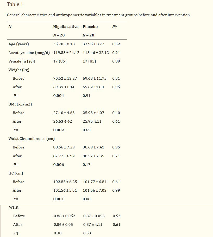 Forty patients with Hashimoto’s thyroiditis, aged between 22 and 50 years old, participated in the trial and were randomly allocated into two groups of intervention and control receiving powdered Nigella sativa or placebo daily for 8 weeks. Changes in anthropometric variables, dietary intakes, thyroid status, serum VEGF and Nesfatin-1 concentrations after 8 weeks were measured.